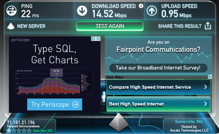The download and upload speeds should be near to what you have subscribed to from your ISP. In the example above, 15Mbps download and 1Mbps upload. Being a little low or a little above is fine and within an acceptable margin of error. I recommend a minimum of 10Mbps down and 1Mbps up to be able to work from home comfortably.
